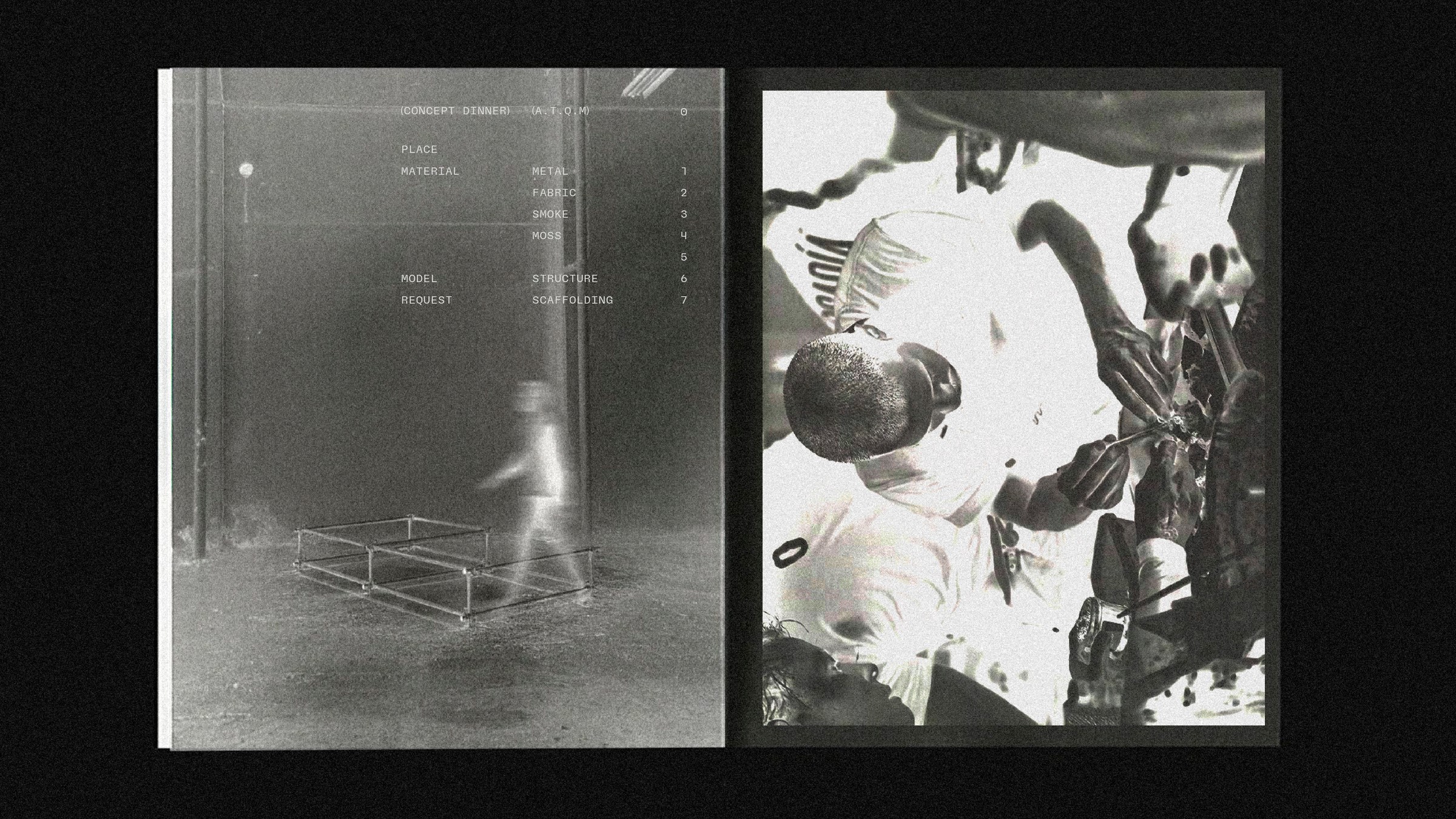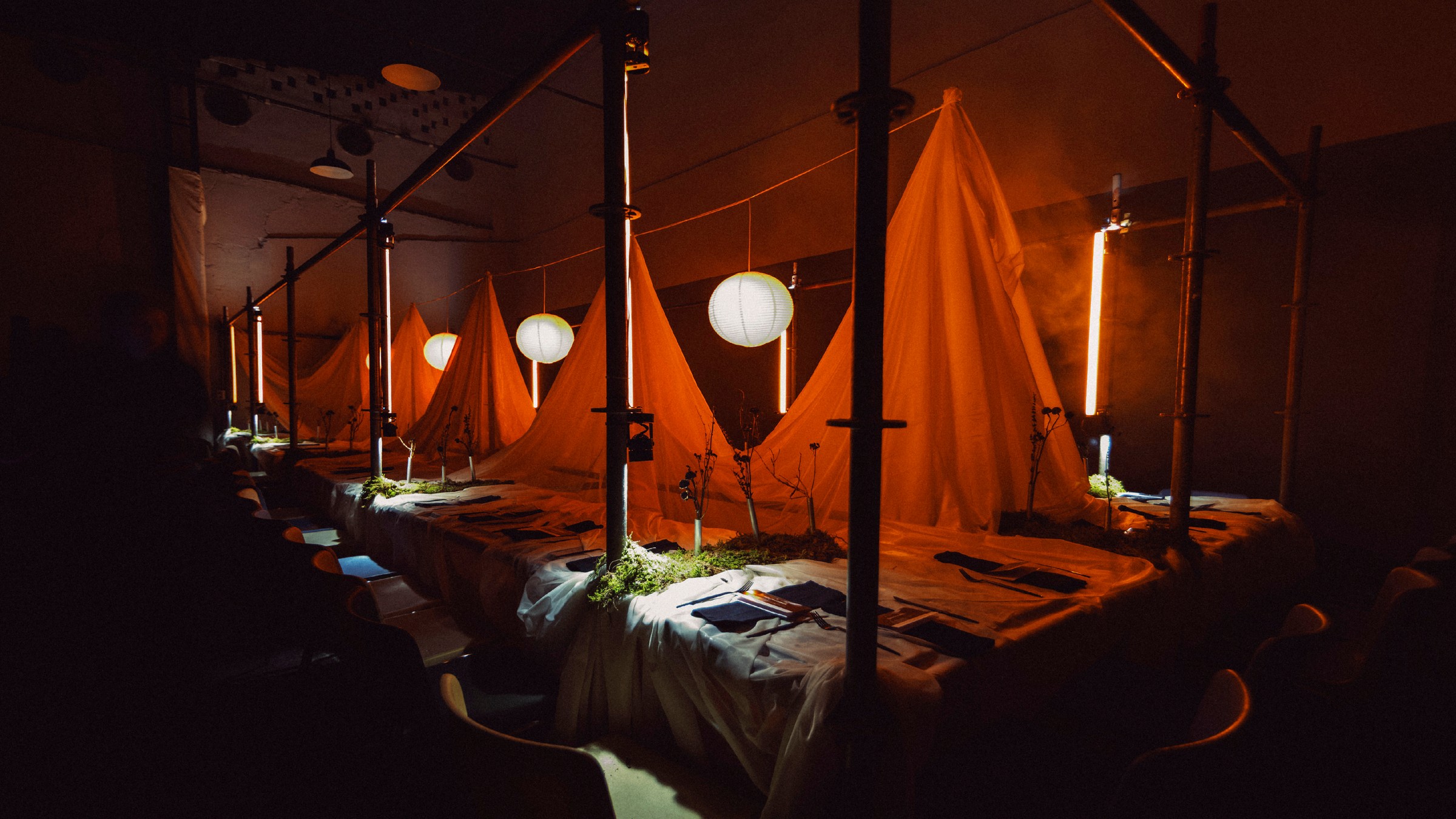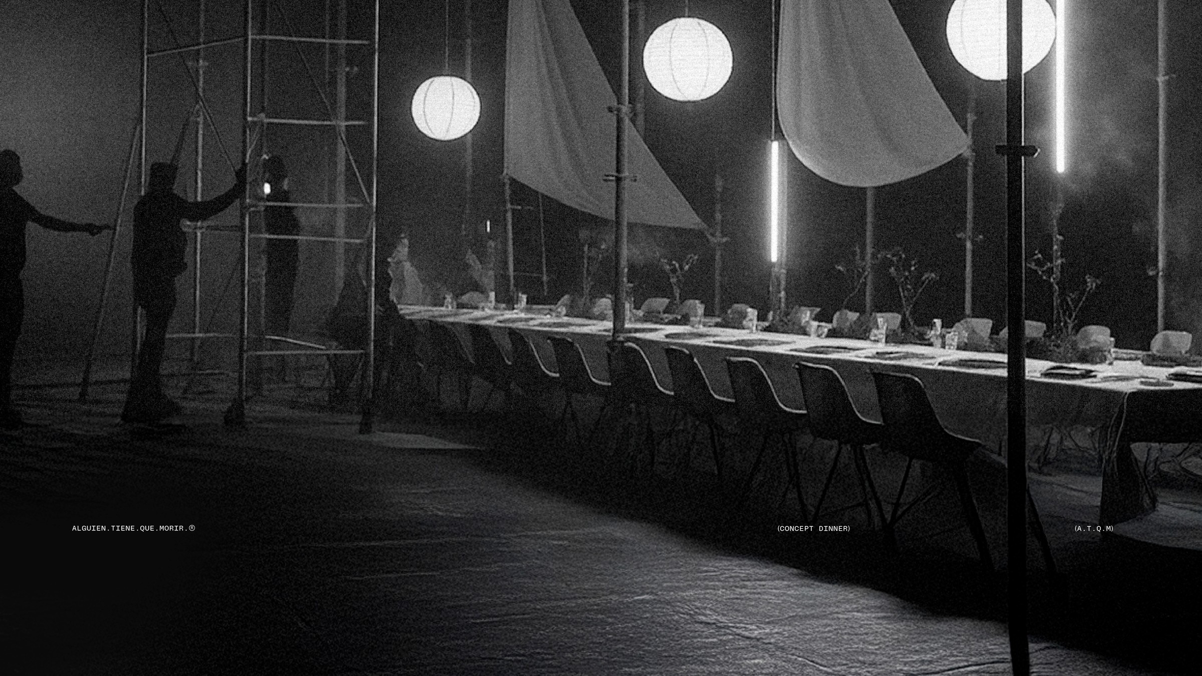 Alguien Tiene Que Morir is a conceptual installation that places a difficult question on the table: what would your last meal be before dying? A living work inspired by death row prisons in the United States, where inmates sentenced to death are granted the choice of a final meal. The installation translates this prison context into the setting of a formal dinner through a deliberate juxtaposition of materials. Metal surfaces contrast with sheer fabric veils that obscure the view across the table, creating a more intimate and introspective experience for each participant. Dim lighting generates faceless silhouettes, accompanied by still-life elements and moss, all in dialogue with tableware designed exclusively for this piece.