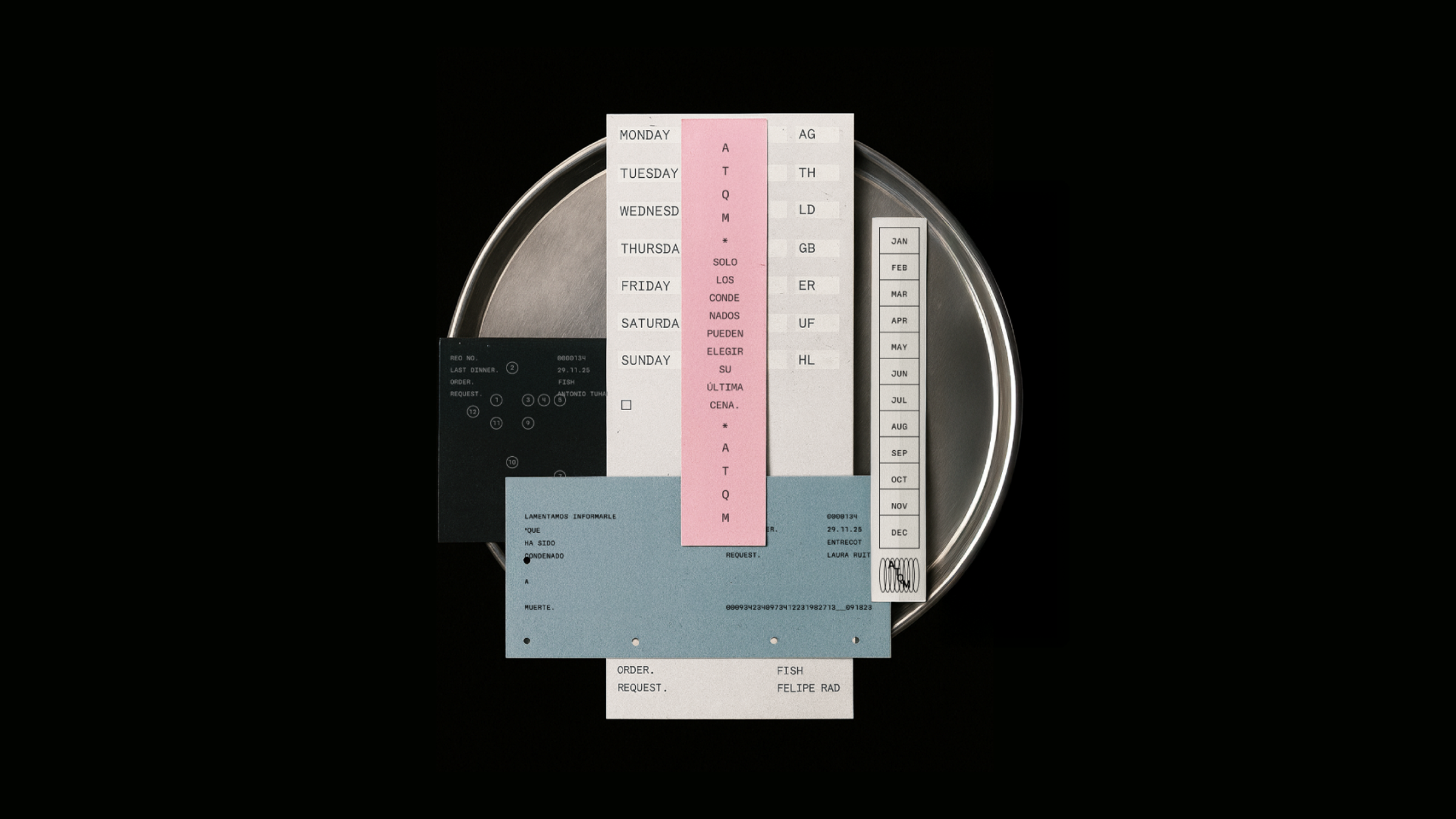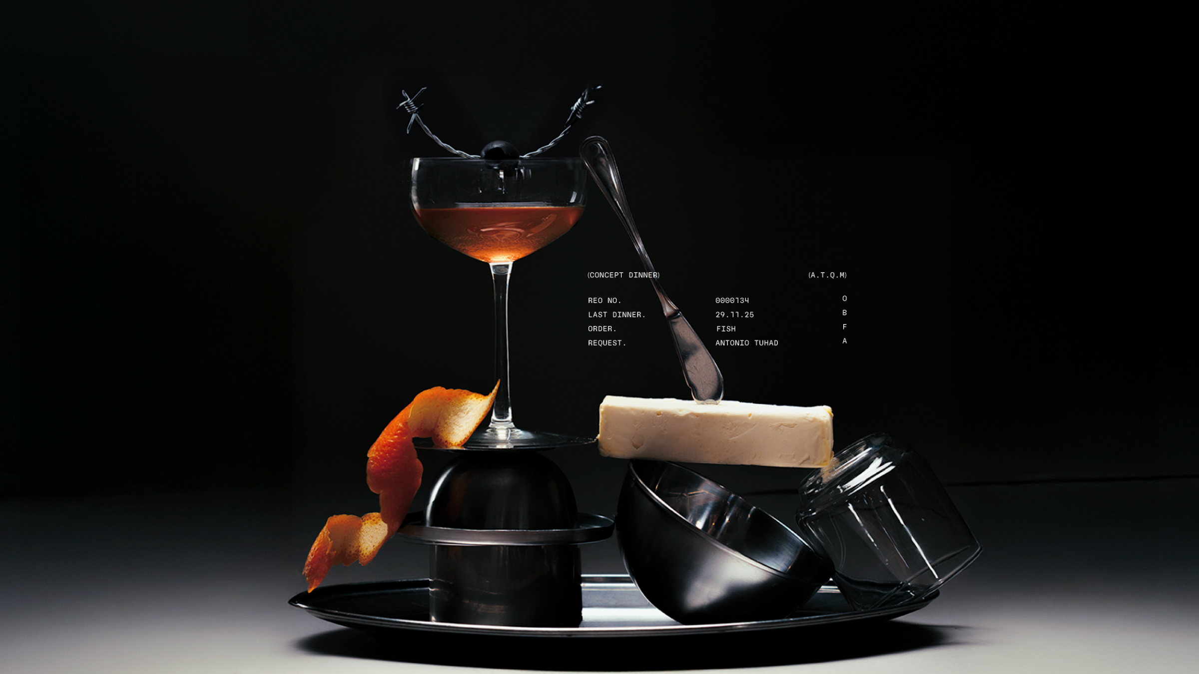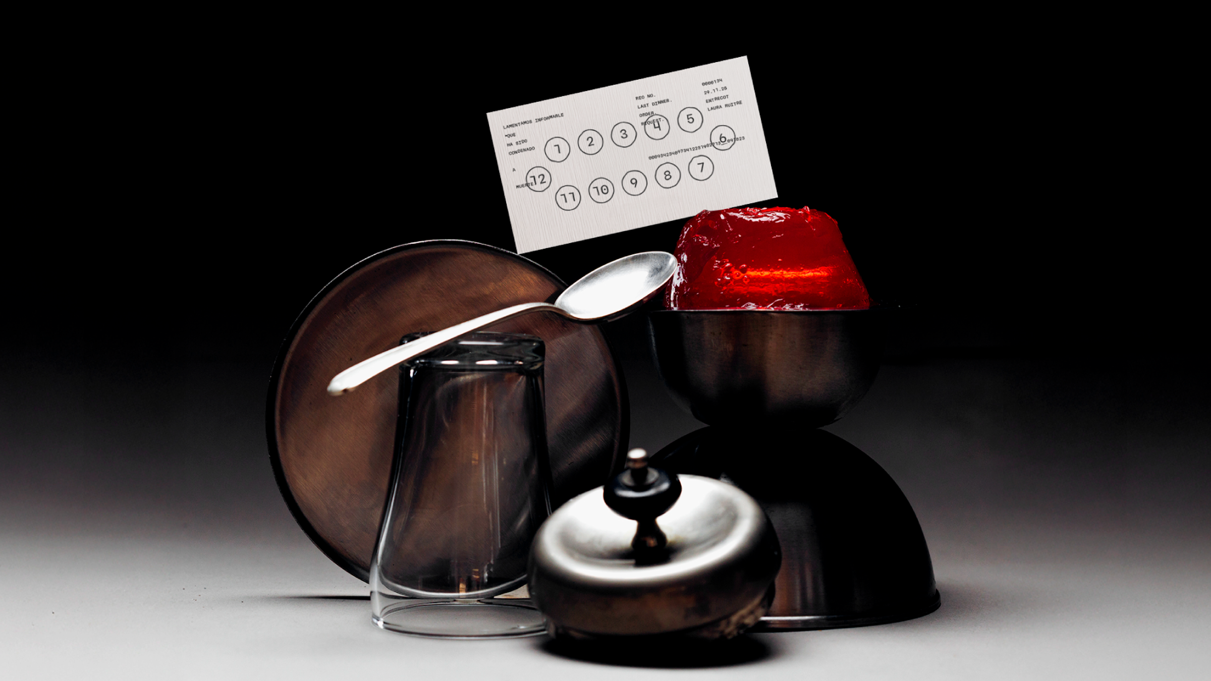 Is a conceptual installation that poses a simple yet uncommon question: what would your last dinner be before dying? An anthropological exploration of our relationship with food and death, brought together at a single table, where attendees are not spectators but active participants in the unfolding of the piece. Four categories emerged from the study of hundreds of last-meal requests found in prison archives: pleasure, remembrance, absurdity, and unfulfilled dreams. Each course of the evening was accompanied by a narrative built around the condemned individual who would have requested that dish. In the final moment of ALGUIEN TIENE QUE MORIR, one attendee was sentenced and, upon request, was served their last meal.